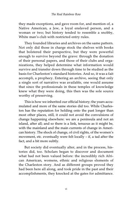 Though Charleston has a reputation for holding onto the past longer than most other places, it could not avoid the shock of change. Much has been written of the city's history of civil rights, and its rich African American, women's, ethnic, and religious past. One of the minority groups long left out of the club has been Charleston's lesbian, gay, bisexual, transgender, questioning, and other sexual minorities community. It's not that they haven't been here all along, making history, contributing greatly to the creation of one of America's most distinctive cities. But, even now, with so many people out and acknowledged, marching in the streets, being elected to public office, and marrying, there are still discrepancies. There are no statues to LGBTQ people (while some discriminatory statutes linger), and very few official mentions anywhere. While other pasts blaze brightly, there is just a flickering of knowledge about local LGBTQ history.